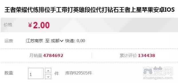 在淘宝上搜索“王者荣耀代练”,出现55页的结果,粗略计算有代练业务的店铺超过上千家。这些店铺在售价上,从不到1元到999元都有,不过人气较高的店铺标价多是1元或2元。月销售量超过100万单的店铺达到8家,其中销售量最多的一家店铺月销售量超过470万单,按照单价2元的价格,月销售额超过900万。更不可思议的是,该店铺的《王者荣耀》代练业务总销量已超过2600万,累计买家评价超过13万。