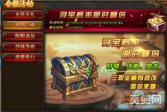 活动内容:合服活动前三天,寻宝概率全部限时翻倍,更有轩辕、伏羲、盘谷三职业稀有首饰大放送!