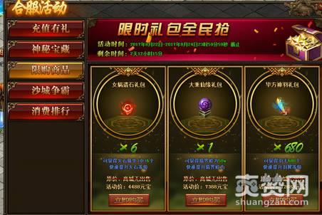 活动内容:合服活动前三天,限时全民礼包疯抢!各种打折礼包,助你迅速提升实力!