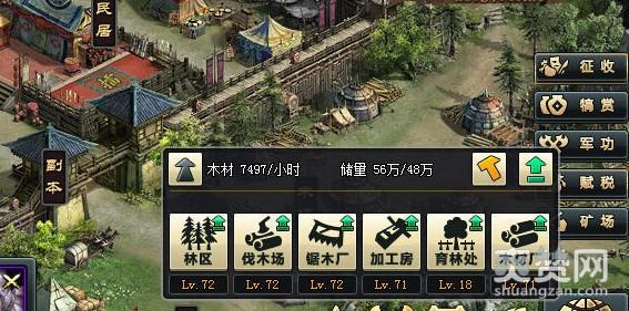 大家都知道后期主要升级农田,兵营,铁矿,但是前期这两天呢,我们先来看下等级,因为在这开区第1~2天内,等级提升的很快,会有很多科技要研究,还有在50级的时候会出现兵器系统,那时候又需要一个大头资源,银币+木头各30W,所以我的玩法是这两天内优先升级木头,让木头等级跟着君主等级走到大概40多级,免费征收大部分也消耗在了征收木头上面(征收是当时基础资源的两倍,所以木头建筑等级一定要高),这样就不会那么缺木头了。