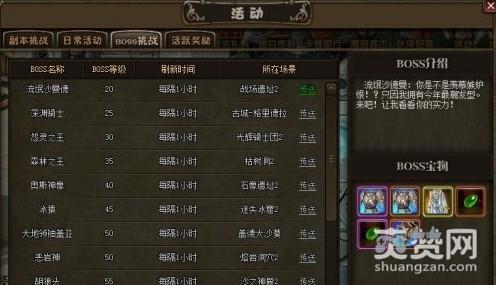BOSS挑战入口。玩家可进入到BOSS所在地图参与BOSS挑战,当然也可以通过屏幕右上角的活动入口直接传送。