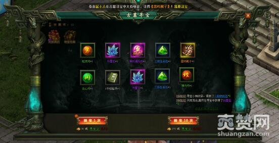 古墓寻宝是一个抽奖系统,根据抽奖类型的不同,抽取的奖励也不相同。玩家可以通过寻宝记录列表来确认自己的抽奖信息。探宝后会有一定比例的积分奖励,可以消耗积分在积分商城兑换其他物品。所有探宝获得的道具都会直接存入寻宝仓库中,也可以通过一键提取将探宝仓库中的道具转移到背包中。