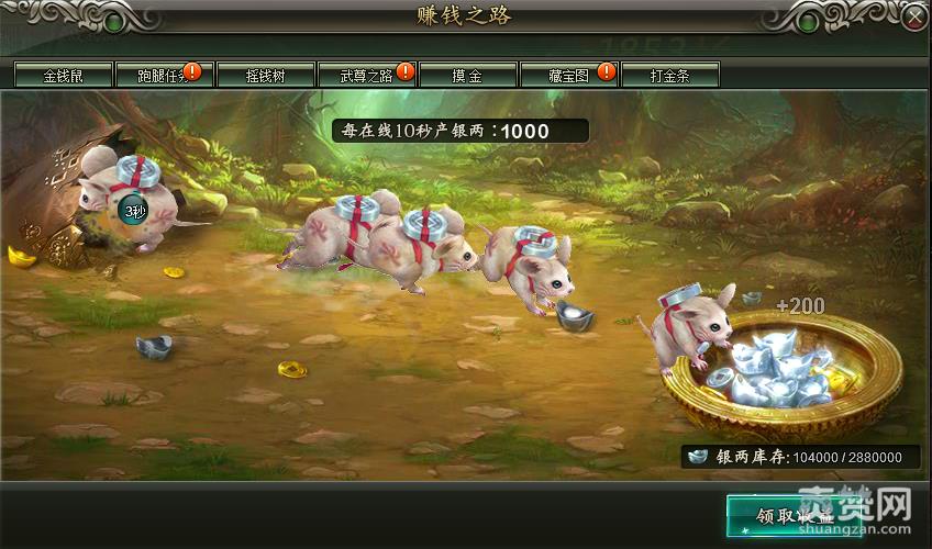 1.金钱鼠:玩家银两收入主要的来源之 一,做完主线,会免费解救一只金钱鼠,每10秒为你挖取200的银两,想要增加挖取速率,就要解救更多的金钱鼠,可以通过shou充,还有商城购买金钥匙等方法来购买,当你拥有5只金钱鼠的时候,在线8小时即可免费获得288万银两,真的是数钱数到手抽筋呀。