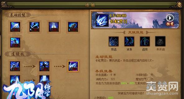 以武当派为例,职业武学主要分两大类:一类是基础技能,没有后续的衔接技能(图中上方五个);一类是连续技能,有后续的衔接技能。 连续技最多为三段、最少为两段,越是靠后的连续技,伤害就越高,控制效果也就越好。例如武当太极剑发一式、太极剑发二式、长虹贯日的连续技,第三段长虹贯日(技能等级80级)可以造成本体攻击力208%的高额伤害,并且有80%的几率将目标冰冻2.5秒。