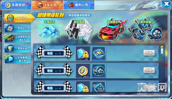 等级礼包:赛车手等级提升,可以领取丰富奖励,珍贵零件、海量钻石、永久赛车等等。