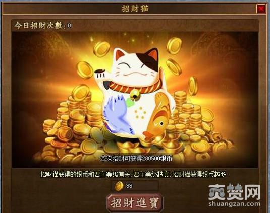 招财猫是玩家使用金币兑换银币的功能,每次消耗88金币,根据VIP等级的不同使用的次数会增加。
