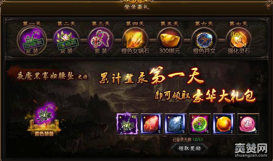 第一天登录:40级紫色腰坠 千年炉石*5 普通强化石*5 一级钱玉*5 淬炼丹*2 还阳丹*2
