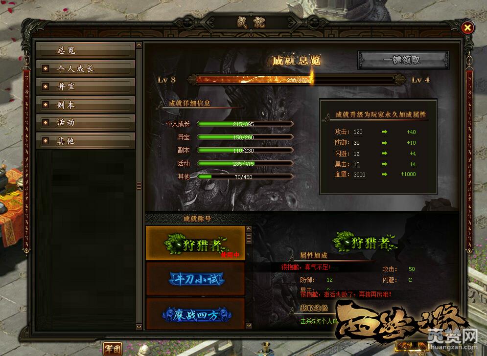 打开界面后玩家可查看对应成就达成条件与奖励,完成对应任务条件可以获得特殊奖励