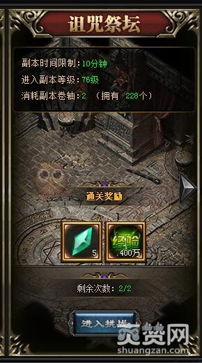 今天我们先进入的副本是材料副本,副本时间限制为10分钟,打通副本后能领取到的奖励是龙魂精华(小),经验400万。传送地图等级需要玩家等级达到76级才能进入,同时还需要消耗2个副本卷轴,如果有一个条件不满足,都是无法进入的。小编推荐大家的战力是9000+。