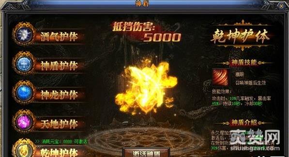 目前梁山传奇内共有5种护体神盾,分别是:抵挡500伤害的酒气护体、抵挡1000伤害的神盾护体、抵挡2000伤害的神龙护体、抵挡3000伤害的天地护体和抵挡5000伤害的乾坤护体。其中前四种神盾属于免费神盾,玩家只要连续登陆游戏一段时间就能获得,而5个神盾中zui厉害的乾坤神盾则需要消耗8888元宝才可激活。