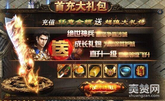 6.首充成长礼包一份,内含高级boss召唤令、热血宝藏钥匙、玛雅卷轴、VIP神殿卷。