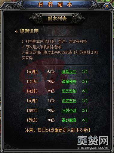 打开材料副本,我们可以看到有6项副本,总共可以进行12次副本攻略。分别是68级可进入的镇魔神殿(每天可以进入2次),过关报酬是光翼进阶的羽毛;69级可进入的邪恶禁地(每天可以进入2次),过关报酬是能提升主角生命上限的龙珠;70级可以进入的幽冥大厅(每天可以进入2次),过关报酬是快速提升主角等级的经验;以及72级可以进入的冰封圣域(每天可以进入2次),过关报酬是提升主角物理,魔法,道术攻击力的龙纹;74级可以进入的雷炎魔窟(每天可以进入2次),过关报酬是提升英雄等级的英雄经验丹,最后是76级可以进入的诅咒祭坛(每天可以进入2次),过关报酬是提升主角暴击几率和暴击伤害的龙魂。以上副本每日早上0点会重置进入副本次数,所以每天的总进入次数是24次。