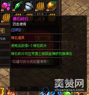 赤月传说神石碎片是神石装备合成或升级必备的材料,玩家要想获得神石碎片,可使用【神石碎片】、【神石结晶】等道具,来获取神石碎片材料。这些神石道具各含有不同数量的神石碎片,直接双击这些道具,就能获得里面的所含的神石碎片。