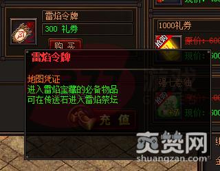 此外,小编温馨提醒,玩家们要想通过其他渠道获得雷焰令牌道具,也可以进入到赤月传说礼券商城里购买,每个雷焰令牌售价为300礼券,如果在条件允许的情况下,想要迅速获得这一道具这也不失为一种方法哦!