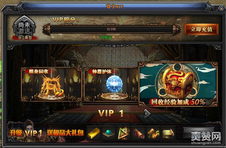 要想获得VIP1大礼包,就必须是VIP1中的一员。充值任意金额就能成为VIP1玩家,享受随身回收、回收经验加成和进入沙藏宝阁等VIP特权。不仅如此,成为VIP1后,玩家还能获得系统赠送的VIP1极 品大礼包,里面有: