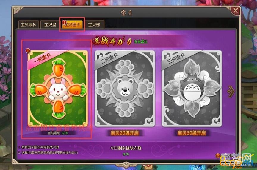 点击“角色”按钮“宝贝”界面中的【宝贝图卡】分页可查看宝贝图卡玩法了。游戏中,宝贝等级每升10级,可开启一套图卡,目前最多可开启6套图卡哦!每套宝贝图卡对应拥有60个等待激活的卡组。