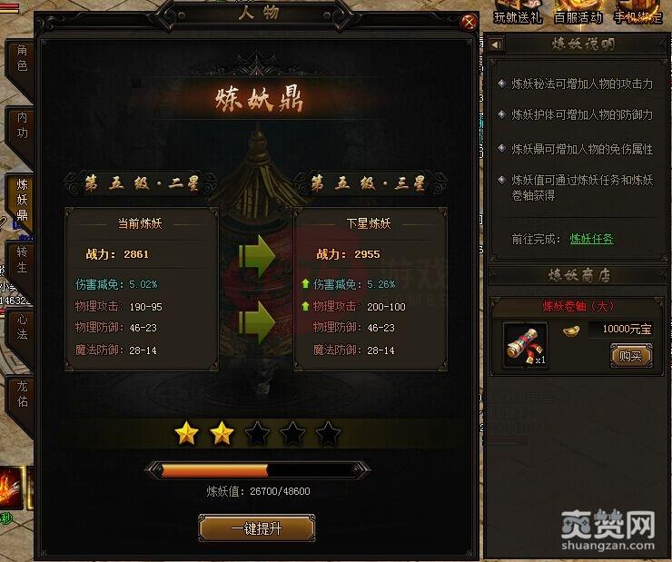 玩家要升级炼妖鼎,只需消耗一些炼妖值即可。当玩家累积炼妖值达到升级上限,点击“一键提升”按钮,就能提升炼妖鼎等级。炼妖鼎等级或星级越高,升级花费的炼妖值会越多。