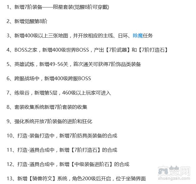 首先最大的变化就是新地图的增加、新觉醒的出现以及新装备的升级。其实这些都是新的拓展,之前的等级装备已经趋于饱和,那么就需要新的任务以及新的试炼,新的地图,能够让本来已经走到顶端的玩家们有更高一层的追求。在BOSS之家,这一次的大更新也新增加了400级的BOSS,能够产出7阶的武器以及7阶的打造石。在这个阶段,极品的武器才能够打的动400级的BOSS,要能够抢得到BOSS就需要求精炼装备。