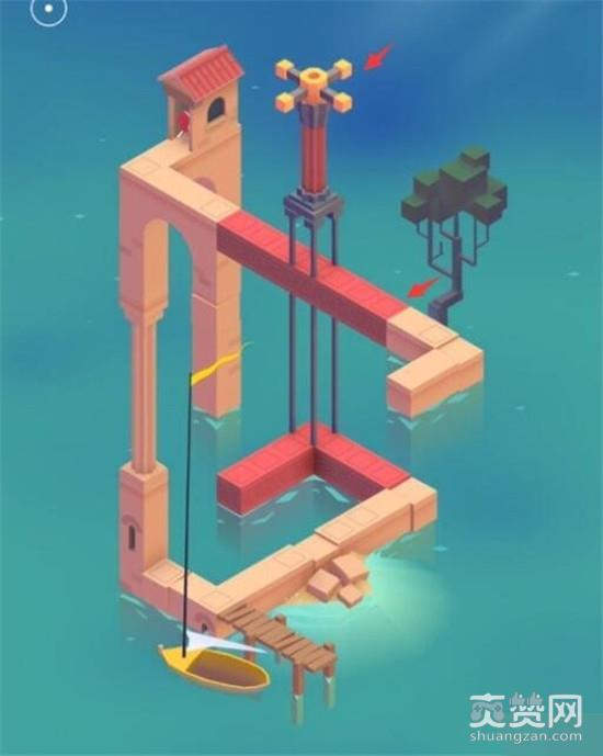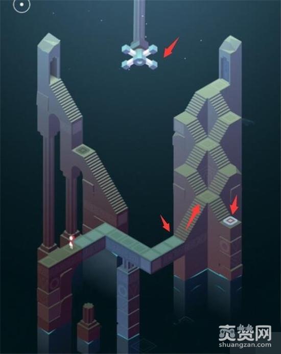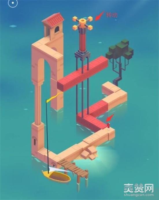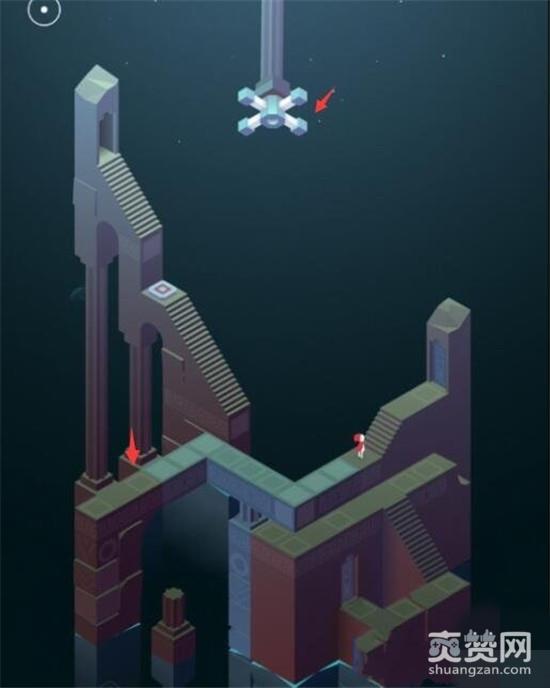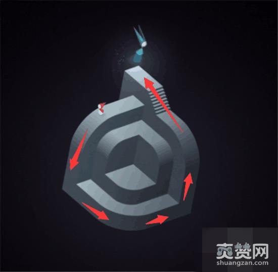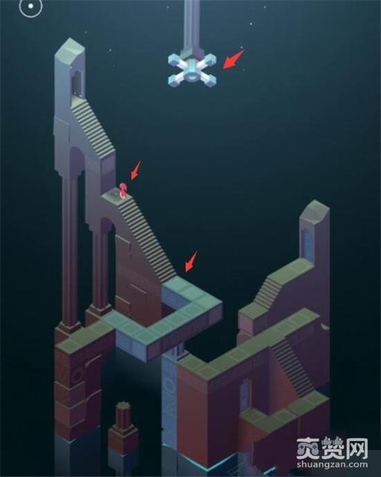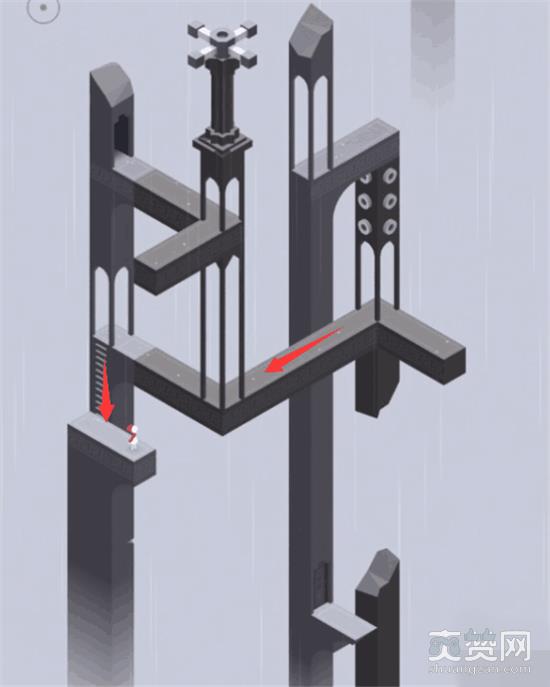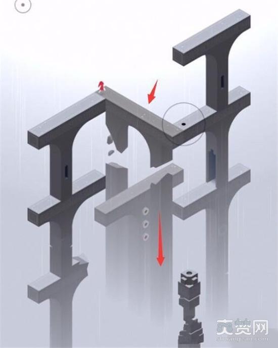 第十四步:萝尔到达最上方右边后,再次转动转轴,使得萝尔站立处与入口相连即可。第十七步:这关比较简单,只要无视重力原理,顺着边缘的道路一直走就能到达蓝色小人儿处,听它说一段逼格很高的话就能过去了。