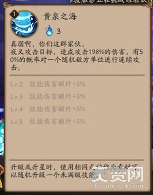 黄海之泉这个技能还是比较有用的。首先,夜叉三技能可以对敌方单体造成攻击198%的伤害,但同时他还有50%的概率对敌方单位进行连续攻击。所以他可以算的上半个群攻式神。