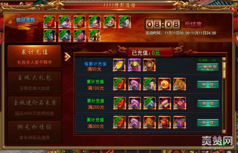 2、玉佩大礼包。这实际上和之前的充值奖励有一点像。要求充值的金额达到500元,并且玉佩的系统到了3阶就能够免费领取相对应的礼包了。礼包当中有重铸卡和金叶子。如果小伙伴们在玉佩的升级上面遇到了一点苦难,那么小编还是建议可以购买的一个的,毕竟双十一,价格还是非常优惠的。