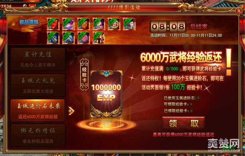 3、玉佩进阶石。类似充值满500就能可以激活这个系统。虽然活动的名字叫做玉佩进阶石。但是实际上是武将升级的任务,6000万的经验返还能够瞬间让你的武将从租出茅庐的小伙子变成久经沙场的壮汉。缺经验的朋友一定要抓紧时间。