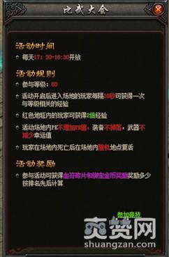 玩家只有到达60级才能够参加比武大会,而且比武大会也不是每天的每个时段都会开放的,只有在每天的17:30-18:30才能够进入。那么进入之后,整个比武大会是怎么样玩的呢?首先在比武大会当中,玩家每次经过10秒就能够获得一次经验,与玩家当前等级有关。这笔经验说多不多,但是说少也不少。所以想要升级的玩家千万不要错过这一次的活动。不然在升级的路上就落下了。其次在斗破沙城当中,在曾哥活动期间比武场地内PK是不会不增加PK值,而且装备不掉落,最重要的是武器不减幸运值。这些规则队友那些pvp狂人来说是非常有诱惑力的。玩家也不要担心死亡,如果.玩家在场地内死亡了,那么随后后会在随机地点复活。