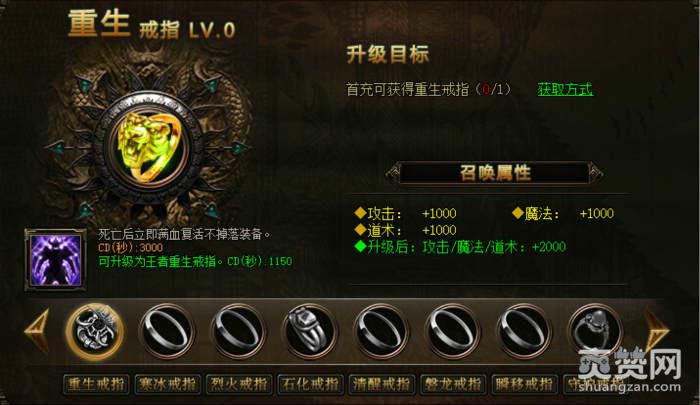 1、重生戒指。在网页游戏当中,最可怕的事情是什么?不是死亡,而是死亡掉了装备。装备是在整个游戏当中最重要的一部分。在整个游戏当中,只有重生戒指有这个功能,能够让你死亡了不掉装备。首充就可以拿到这个戒指了。在游戏当中的什么环境当中,多出一条命可以说不要强大太多。