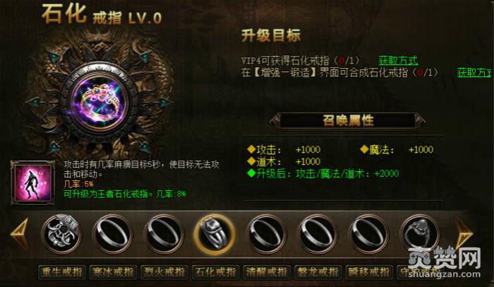 2、石化戒指。这枚戒指的大名在各种网络小说当中都有登场。都在主角的各种阶段发挥出了非常强大的作用。在斗破沙城的游戏当中,这枚戒指也大放异彩。效果表现为攻击时候有几率麻痹对手5秒,无法使用技能和移动。非常强大,麻痹类型的控制能够在pvp当中有足够的控制效果,5秒的时间也给了玩家足够的反应时间去放出一个大技能。这枚戒指只要vip4就可以获得了。