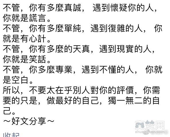 照片中,是这样一段文字:“不管你有多么真诚,遇到怀疑你的人,你就是谎言。不管你有多么单纯,遇到复杂的人,你就是有心计。不管你有多么的天真,遇到现实的人,你就是笑话。不管你多么专业,遇到不懂的人,你就是空白。所以,不要太在乎别人对你的评价,你需要的只是做最好的自己,独一无二的自己。”