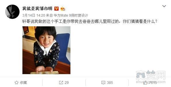 近日,邹市明将儿子轩轩的近照上传到微博并写到,“轩哥说我做的这个手工是你带我去爸爸去哪儿里用过的,你们猜猜看是什么? ”照片的轩轩较以往明显瘦了,皮肤也有些晒黑,手里捧着四根类似筷子的竹条,引起网友们的火速围观。