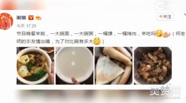 1月17日晚餐时间一到,谢娜微博晒出几张美食照,并发文介绍今日菜谱有,“一大碗面,一大碗粥,一桶馍,一桶烤肉。”为了证明碗是真的大,何炅还在一旁比出剪刀手作为参考。看来,这两位老朋友今天又在一起录节目,晚餐也在现场解决了。