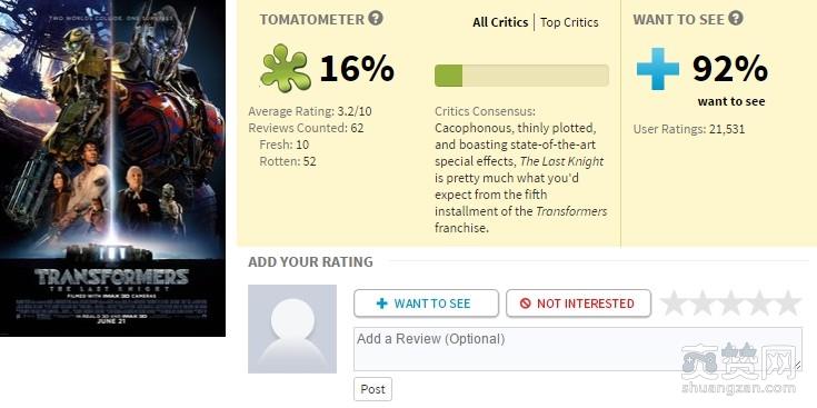 在烂番茄上,《变形金刚5》比最近环球口碑扑街的大片《新木乃伊》还要惨淡得多,本片开局口碑仅为16%新鲜度(均分 3.2),62个评价中10新鲜52烂。