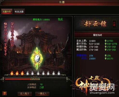 想拥有法器当然不会那么简单,首先需要等级达到65级后才可开启法器系统。法器可以进行升阶,越高的等阶,属性加成越大。法器升阶需要使用魂力,魂力可使用魂力丹进行提升,魂力丹可通过击杀深渊迷宫的BOSS及商店购买来获得。