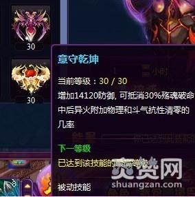 意守乾坤30级满级后可抵消30%殇魂破命中后斗破苍穹2异火附加物理和斗气抗性清零的几率,增加14120防御。