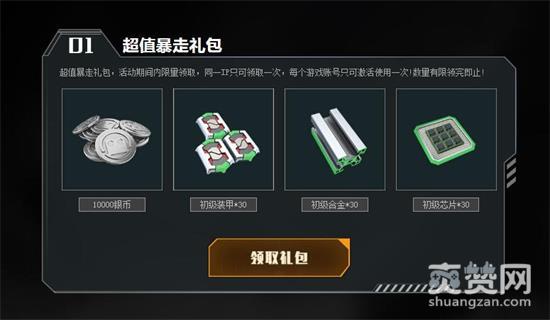 在活动页面中,所有玩家均有机会领取一个“超值暴走礼包”,礼包中包含10000枚银币、30个初级装甲、30个初级合金以及30个初级芯片。礼包赠送材料均可在《暴走装甲》的游戏中使用,通过装甲改造,玩家可以亲手打造出最尖端的高科技未来装甲。