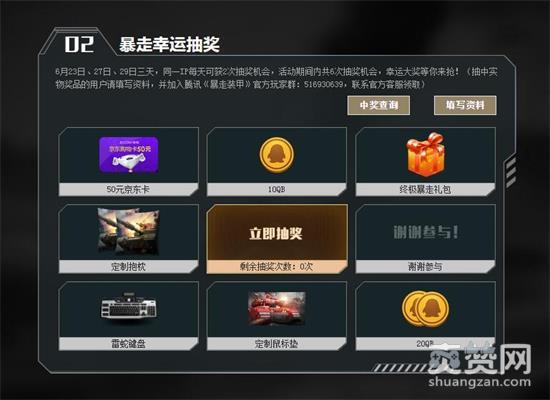 用户在6月23日、27日及29日三天前往活动页面,可以获得总共6次幸运抽奖机会。奖品包括机械键盘、《暴走装甲》限量定制抱枕、定制鼠标垫以及海量京东券、Q币卡,中奖几率极高,绝对不要错过!中奖用户别忘了填写联系方式,加入玩家官网群领取奖品哦!