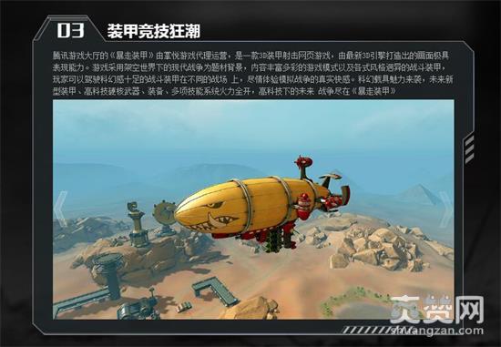腾讯平台的《暴走装甲》由掌悦游戏代理运营,是一款全3D装甲射击网页游戏,由最新3D引擎打造出的画面极具表现能力。游戏采用架空世界下的现代战争为题材背景,内含丰富多彩的游戏模式以及各式风格迥异的战斗装甲,玩家可以驾驶科幻感十足的战斗装甲驰骋在不同的战场上,尽情体验模拟战争的真实快感。科幻载具魅力来袭,未来新型装甲、高科技硬核武器、装备、多项技能系统火力全开,高科技下的未来战争尽在《暴走装甲》!