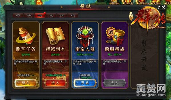 帮派不仅有跨服战,还有其他有趣的玩法,当玩家所在的帮派等级达到3级时即可开启南蛮入侵,活动开启后,敌人将从,东、南、西三个方向进攻,帮派中的兄弟需要消灭三个方向的来敌,保证帮派旗帜宝藏的安全即可,而且37《三国群将传》的帮派兄弟要尽快击杀,保证图中央的宝藏血条不被入侵的怪物消灭。只要防守成功,系统将会根据玩家个人的积分发放奖励。