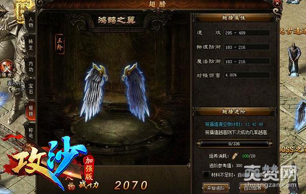 3、这里需要特别说明:翅膀并非角色独有,英雄也可以拥有自己的翅膀!英雄的翅膀同样有多种属性加成,但是和角色翅膀升级不同,英雄的翅膀升级相对简单!玩家只需要消耗绑金就可以完成进阶!