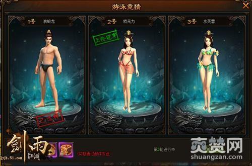 一号浪蛟龙、二号娇无力、三号水芙蓉,这一男两女的游泳比赛,到底谁会摘下桂冠呢?在51《剑雨江湖》的世界中,无论是午间温泉还是晚间温泉,只要进入到温泉现场的玩家,都可以在精彩界面选择一位参赛者,点击“猜他赢”,参与竞猜!