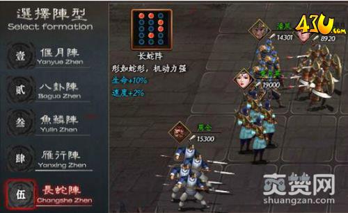 长蛇阵——长蛇阵机动性很强,但是因为是铺开一线的作战阵型,因此战斗力相对较弱。阵型属性为生命值+10%、速度+2%,被锥形阵阵型相克。