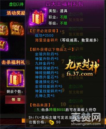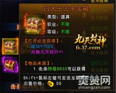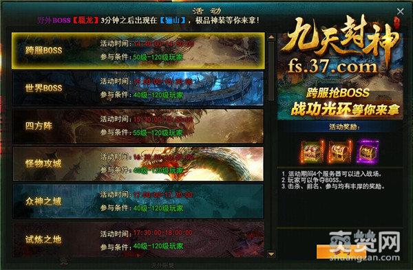 即使你有信心,还得符合条件,该系统默认合格挑战的玩家必须是10个战斗力排最前的在线玩家。当然,跨服BOSS也不是让你白打,在37《九天封神》中,只要你有胆量去打BOSS,就能够获得物品奖励,击败难度越高的BOSS所获得的奖励将会越丰富哦!