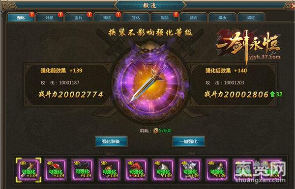 在37《一剑永恒》中,锻造系统由几个模块组成,最重要的就是“强化、升星、宝石、铸炼”,这样的细分可方便玩家更好地提升人物角色的属性,其中,“强化”功能会消耗一定的铜币强化装备属性,部位不同强化属性不同,强化等级上限不能超过人物等级。