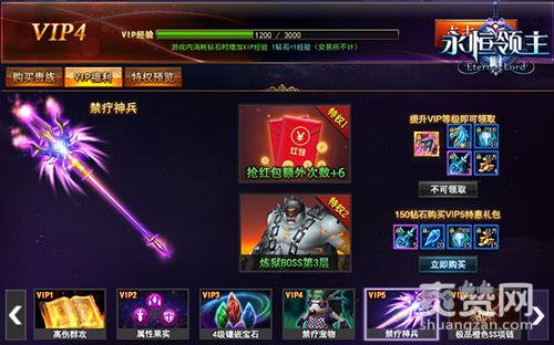 VIP5:特权—抢红包额外次数+6、进入炼狱BOSS三层资格,免费礼包(禁疗神兵、初级坐骑进阶石X10、2000灵力X10、2倍经验药水X3、10万金币X4),特惠礼包(2倍经验药水X5、初级强化石X20、2000灵力X15、10万金币X15,150钻石可购买)