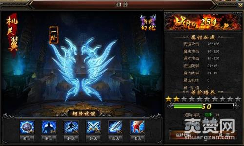 翅膀62级开放,每一阶段的翅膀都有翅膀称号,如一阶为机关翼,造型似金属羽翼,极为华丽。翅膀每阶有10星级,每提高10星即可提高一阶,每提高一阶会改变当前翅膀称号及其形象,更能提升属性能力,坐骑升阶需要消耗羽毛,满足材料时候通过点击右侧翅膀升阶按钮提升翅膀品阶,一键一星为快速升阶按钮。