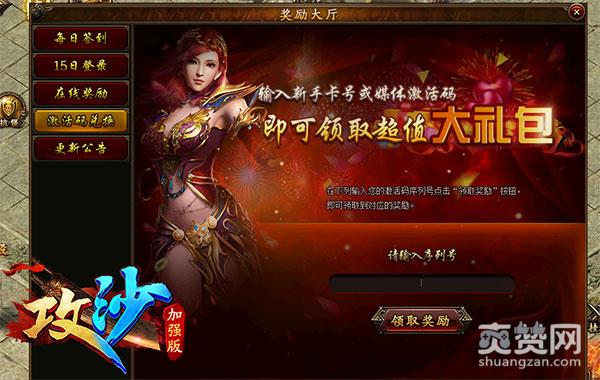 2、玩家领取礼包激活码后,打开奖励大厅界面,在激活码兑换处输入攻沙独家礼包激活码,便可兑换资源奖励。