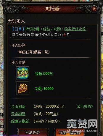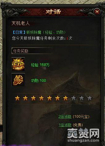 根据斩妖除魔的难度程度,可以分为10个星级,任务的星级越高,玩家能够获得的奖励就越丰厚,若是对当前的任务星级不满意,可以通过金币、元宝或者除魔令来刷新任务的星级,直到刷新出领玩家自己喜欢的星级任务。由于斩妖除魔需要消耗大量的精力,因此,玩家每天斩妖除魔的次数都会有一个限制,此外,玩家还可以通过消耗元宝来立即完成任务从而节省下大量的时间。赶快加入游戏,斩尽一切妖魔,维护世界和平吧!