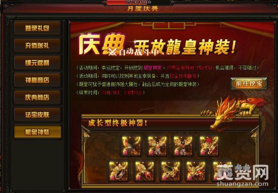 传说龙皇神装藏在“月度庆典”里面,在幸运挖宝活动期间,开放挖到“龙皇神装”。仅在傲天赤月传说2百服期间才能挖到,机会难得不容错过。即便挖不到“龙皇神装”,起码也会有其他主宰装备,挖宝几率还会翻倍。据称龙皇套装可赋予普通首饰强大的属性,融合后将成为全新的龙皇神装。竟有如此牛逼的融合功效,难怪玩家们会趋之若鹜没日没夜地去挖宝。
