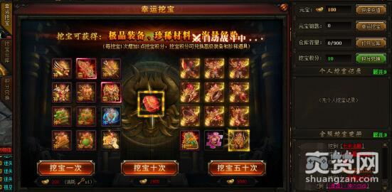 这就是幸运挖宝,里面除了神器、龙皇神装,还有许多江湖上顶尖材料。小编曾用挖宝钥匙挖过一次,没有获得什么好东西,估计不动用点真格的元宝还是很难出点好东西吧。土豪们拿出9800元宝,老板挖50次试试,没准还真能出来一枚傲天赤月传说2龙皇神装。
